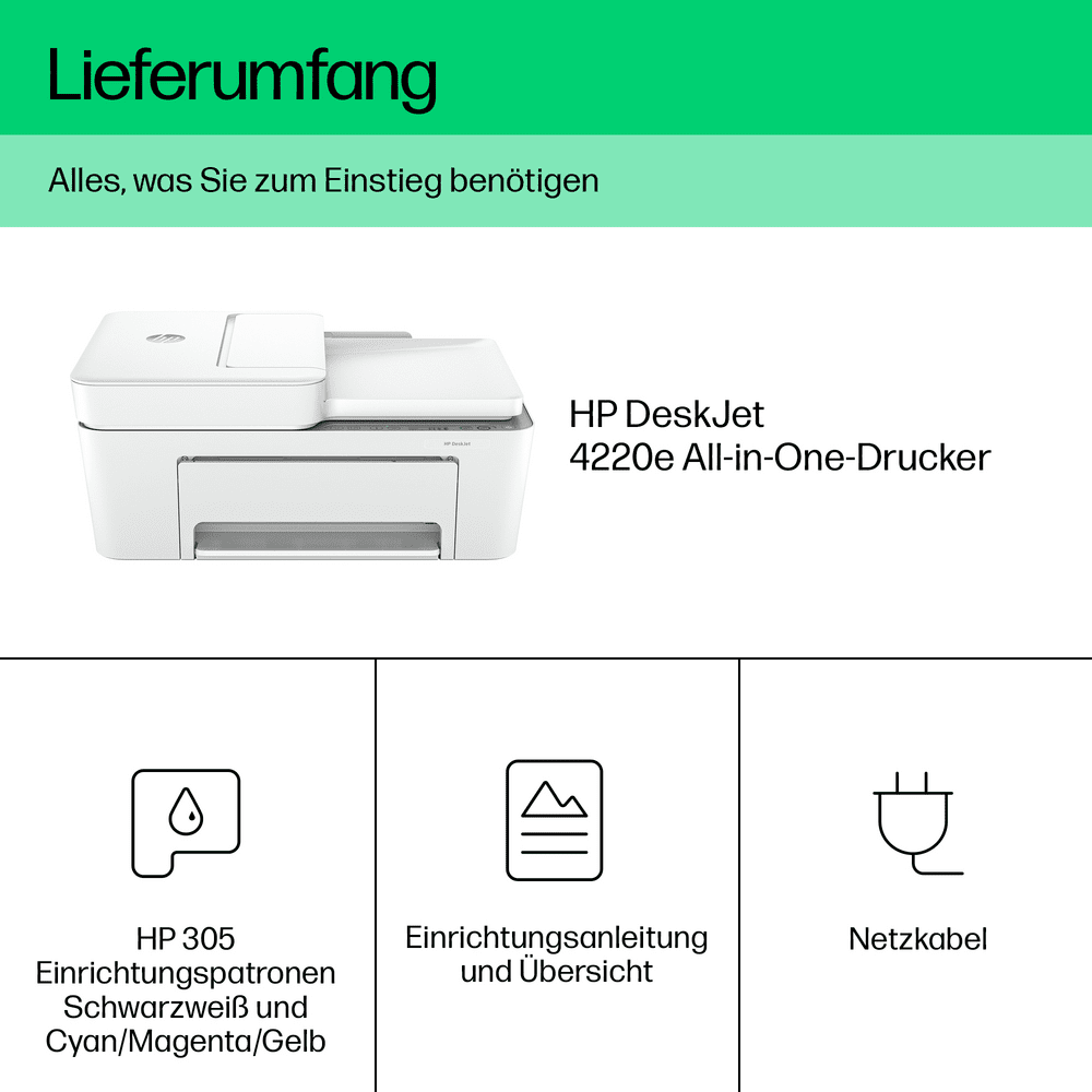 | Enthaltene Verbrauchsmaterialien | 1 x Tintenkartusche (Schwarz) - HP 305 ¦ 1 x Tintenkartusche (Gelb / Cyan / Magenta) - HP 305 |