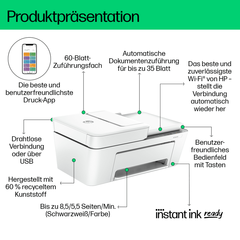 | Büromaschinen-Merkmale | HP Instant Ink, Ausdruck von Mobilgeräten, Scan-to-PDF |